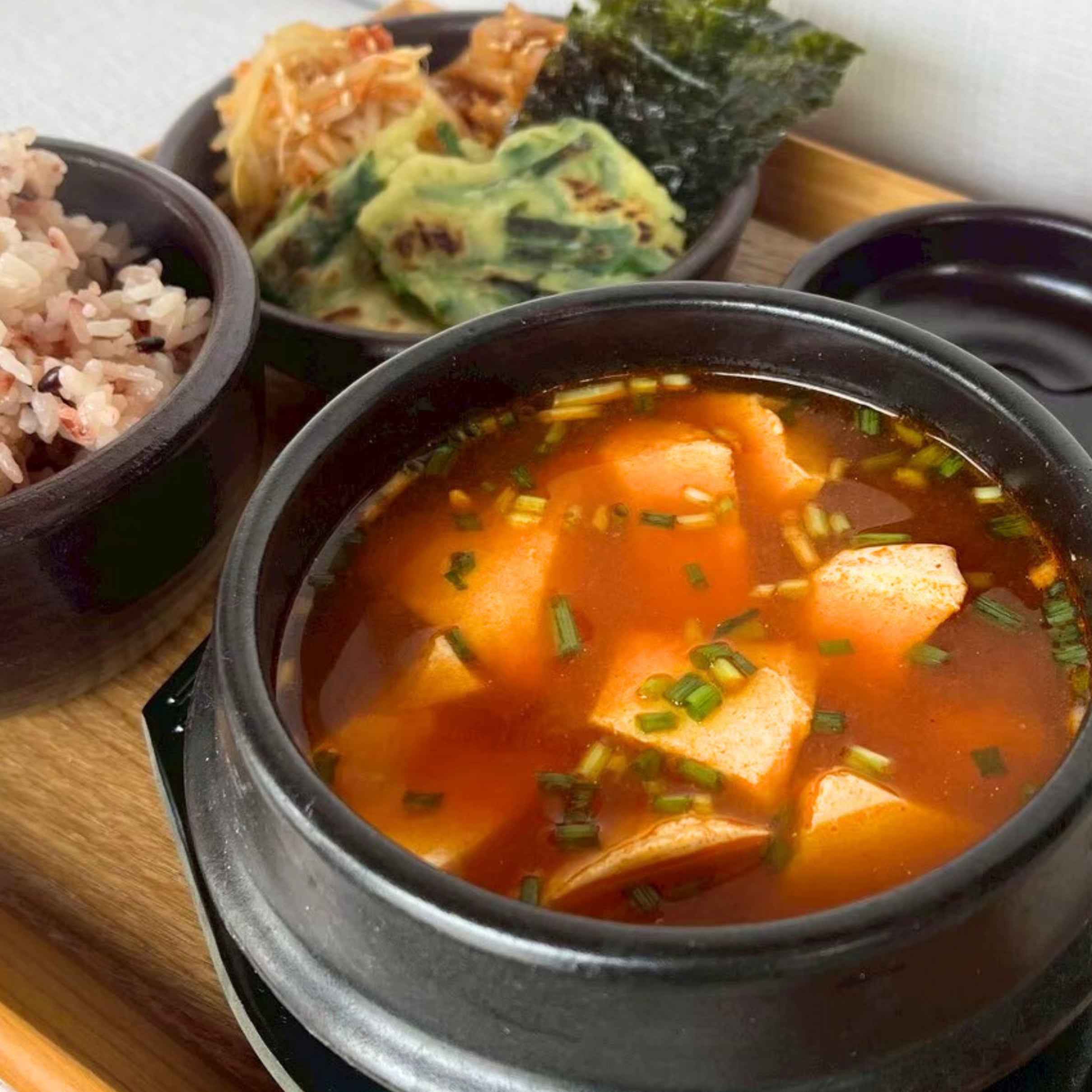 海鮮や肉の旨味が溶け込んだコクのある韓国の豆腐チゲ。